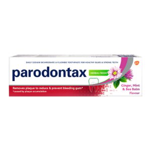 พาโรดอนแทกซ์ เฮอร์บัล เฟรช มาพร้อมพลังปกป้อง 4 เท่า ในการช่วยจัดการคราบพลัค จึงช่วยลดและป้องกันเลือดออกขณะแปรงฟันที่เกิดจากคราบพลัคสะสม พร้อมฟลูออไรด์ป้องกันฟันผุ และให้รสชาติถูกใจจากสมุนไพร ขิง มิ้นต์ และบีบาล์ม คุณจึงมั่นใจได้เต็มที่ว่า เหงือกสุขภาพดี ฟันแข็งแรง และลมหายใจสะอาดสดชื่น