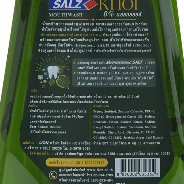 ซอลส์ น้ำยาบ้วนปาก สมุนไพรข่อย น้ำยาบ้วนปากคุรภาพดีที่ผสานคุณค่าจากสารสกัดสมุนไพรข่อย พืชในตำราสมุนไพรไทยที่ใช้คู่กับเกลือในการดูแลช่องปากมาแต่โบราณ ปลอดภัยปราศจากแอลกอฮอล์ และสารพาราเบน มีประสิทธิภาพในการช่วยลดกลิ่นปากได้เหนือกว่า พร้อมมอบความสดชื่นด้วยกลิ่นสมุนไพรให้ลมหายใจหอม สดชื่น มั่นใจได้ว่าปากของคุณจะสะอาดสดชื่นทุกครั้งหลังใช้งาน ผสมผสานกับเกลืออณูเล็กเข้มข้น (Hypertonic Salt) และฟลูออไรด์ (Fluoride) ช่วยดูแลเหงือกและฟันให้มีสุขภาพดี