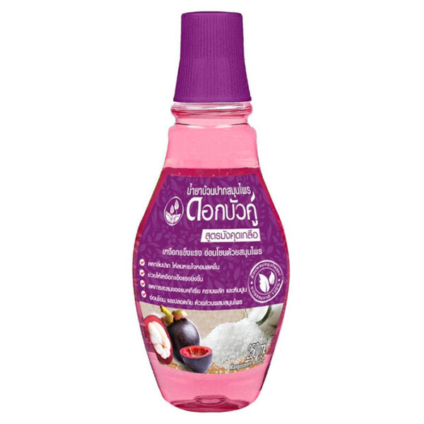 ดอกบัวคู่ น้ำยาบ้วนปากสมุนไพร สูตรมังคุดเกลือ ระงับกลิ่นปากพร้อมดูแลสุขภาพเหงือกให้แข็งแรง ผสานประโยชน์จากเกลือบริสุทธิ์ มังคุด และสมุนไพรนานาชนิด