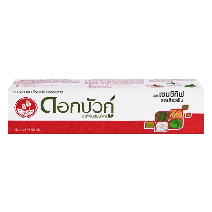 ดอกบัวคู่ ยาสีฟัน สูตรเซนซิทีฟ ยาสีฟันคุณภาพดีที่เต็มไปด้วยประสิทธิภาพในการลดอาการการเสียวฟัน และลดการสะสมของแบคทีเรีย ที่ได้จากการผสมผสานคุณประโยชน์จากหญ้าหนวดแมว หญ้าดอกขาว และสมุนไพรคุณภาพดีอื่นๆ อีก