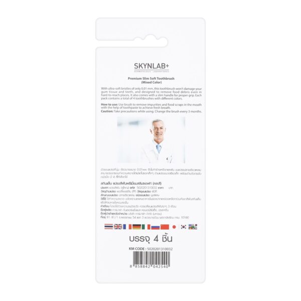 สกินแล็บ แปรงสีฟันพรีเมี่ยมสลิมซอฟท์ ด้วยขนแปรงที่นุ่ม เรียวบางขนาด 0.01mm จึงไม่ทำร้ายเหงือกและฟัน ขนแปรงปลายเรียวแหลมสามารถซอกซอนทำความสะอาดได้แม้แต่ในซอกเล็กๆ ด้ามแปรงขนาดเรียวเล็ก พร้อมด้ามจับกระชับถนัดมือ