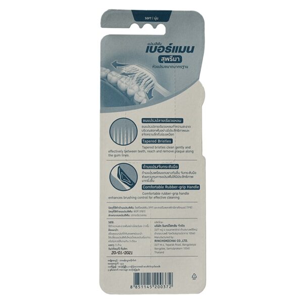 เบอร์แมน แปรงสีฟัน สุพรีมา ซอฟท์ เซฟวิ่ง แปรงสีฟันที่มีขนแปรงปลายเรียวแหลม ออกแบบให้สามารถทำความสะอาดบริเวณซอกฟันอย่างมีประสิทธิภาพและขจัดคราบลึกถึงร่องเหงือกได้อย่างดีเยี่ยม โดยมาพร้อมด้ามจับแปรงที่กระชับมือ พร้อมแถมยางกันลื่นซึ่งช่วยให้จับได้กระชับมือมากยิ่งขึ้น ควบคุมการแปรงฟันให้มีประสิทธิภาพมากยิ่งขึ้น